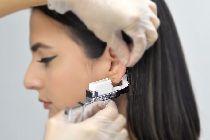 Before piercing, your ears will be cleaned with an alcohol swab. The piercing itself is done with a piercing gun. Our "touch-free" ear piercing process highlights safety and hygiene.